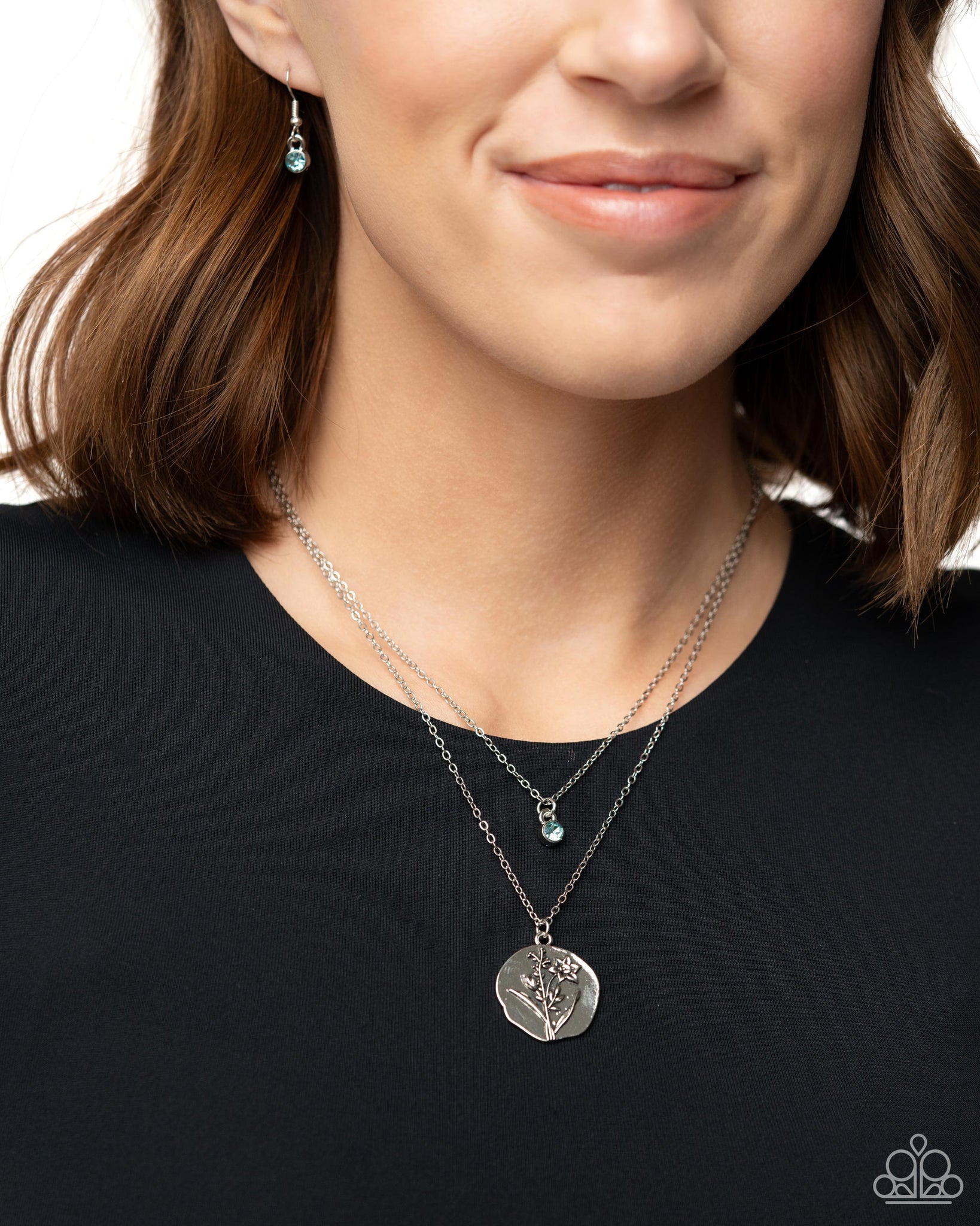 Two shimmery silver chains layer down the chest. Featuring an aquamarine rhinestone in a silver frame, the uppermost strand gives way to a classic silver pendant featuring an embossed daffodil flower, flawlessly displaying the sentimental symbols that celebrate those born in March. Features an adjustable clasp closure.