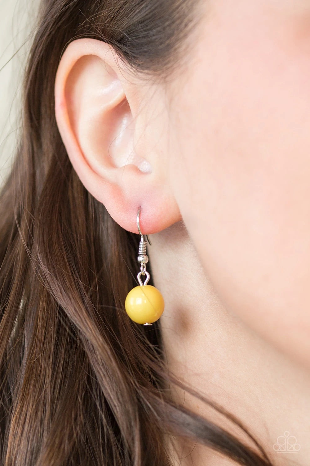 A collection of glassy and polished yellow beads give way to layers of mismatched silver chain for a whimsical look. Features an adjustable clasp closure.
