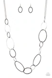 Swinging from doubled gunmetal chains, oversized asymmetrical hoops dramatically link across the chest for a refined industrial look. Features an adjustable clasp closure.