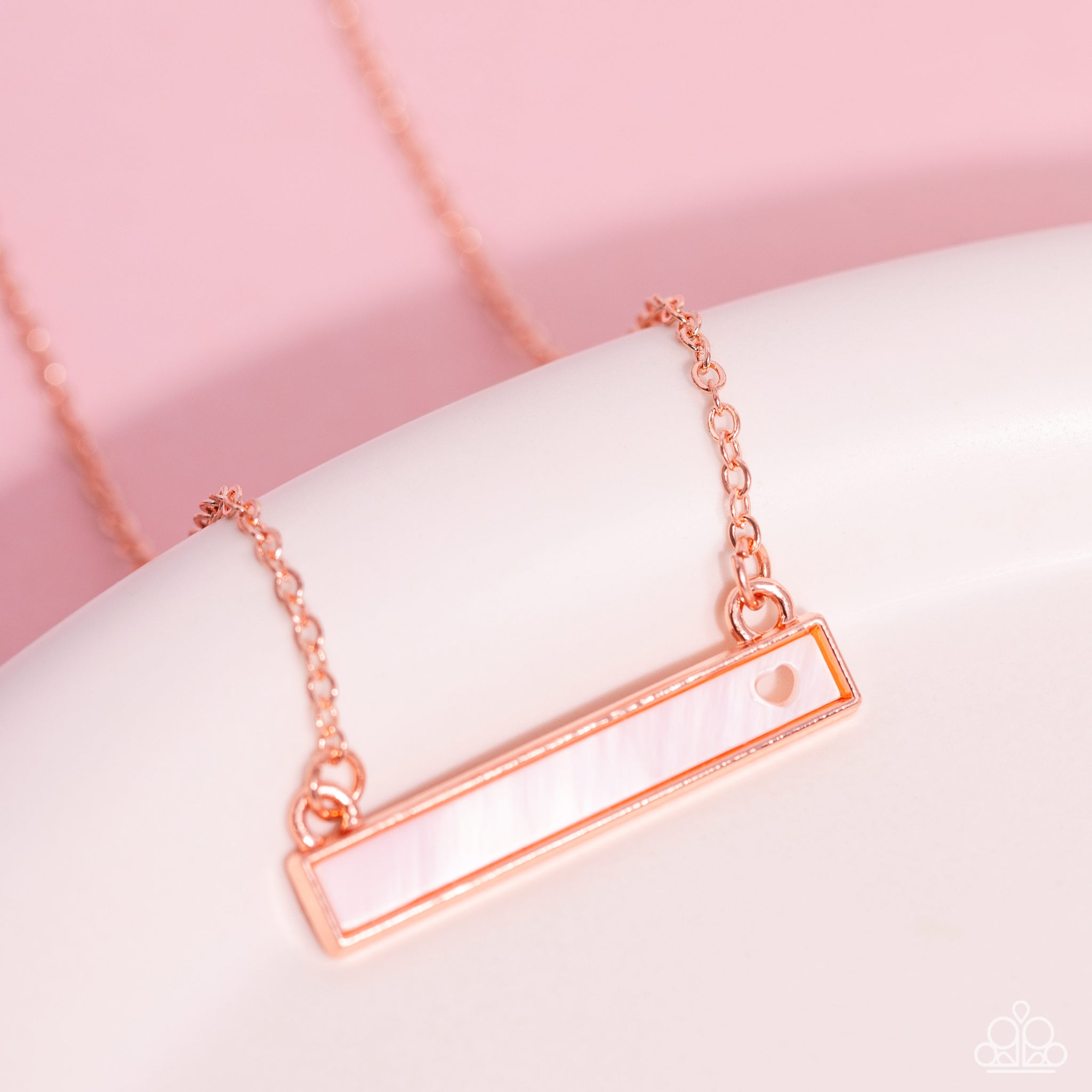 Featuring a dainty heart cutout, a rectangular white shell, pressed in a shiny copper plate is suspended below the collar by a dainty shiny copper chain, creating a whimsically romantic pendant. Features an adjustable clasp closure.