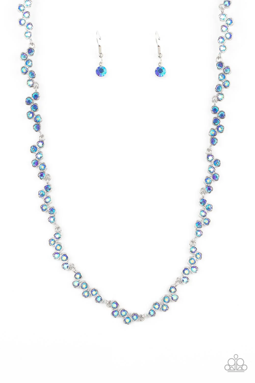 Set in dainty silver heart-shaped frames, staggered clusters of glassy sapphire rhinestones delicately link into a flirtatious hint of sparkle below the collar. Features an adjustable clasp closure. Due to its prismatic palette, color may vary.