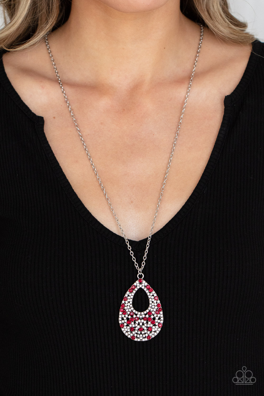 A sparkly explosion of glassy white and fiery red rhinestones haphazardly coalesce into a teardrop frame at the bottom of a lengthened silver chain, creating a twinkly pendant. Features an adjustable clasp closure.