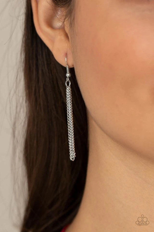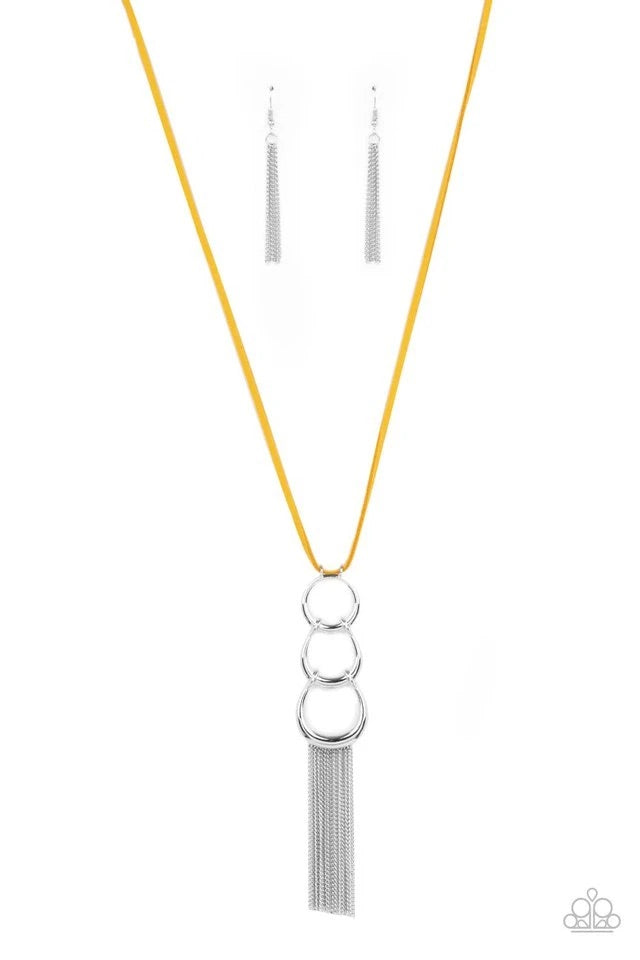A bold silver ring gives way to two interlocking half moon silver frames at the bottom of a lengthened piece of yellow suede. Shimmery silver chains swing from the bottom of the display, adding flirty movement to the stationary pendant. Features an adjustable clasp closure.