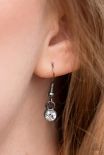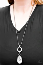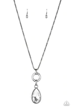 Encrusted in glittery white rhinestones, a shimmery gunmetal ring gives way to a dramatic white gem teardrop. The impressive pendant slides along a shimmery gunmetal popcorn chain for a refined look. Features an adjustable clasp closure.