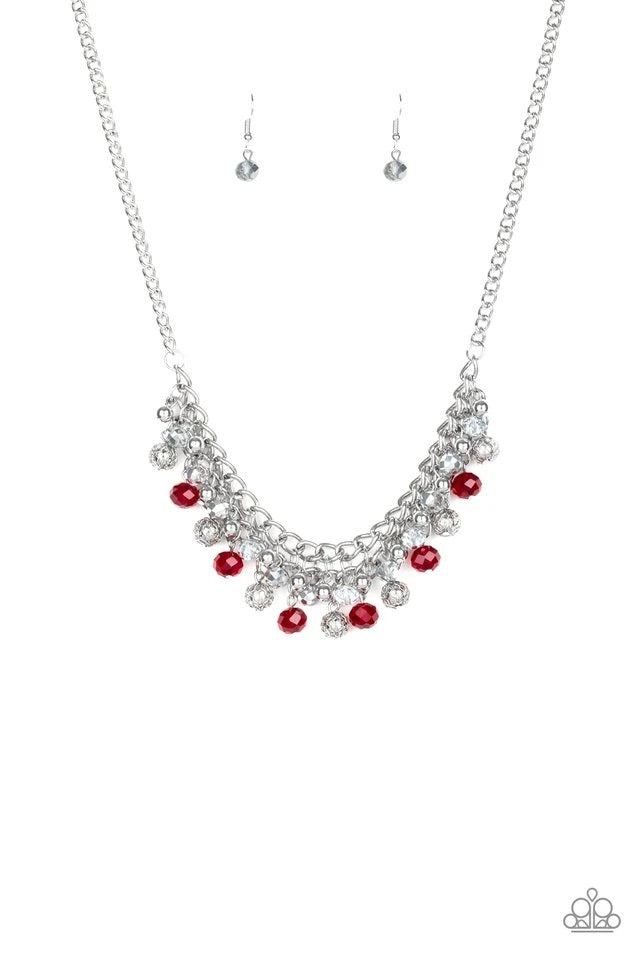 A collection of metallic net covered beads, shiny silver beads, and glittery red and metallic flecked crystal-like beads swing from the bottom of interlocking silver chains, creating a refined fringe below the collar. Features an adjustable clasp closure. Sold as one individual necklace. Includes one pair of matching earrings.