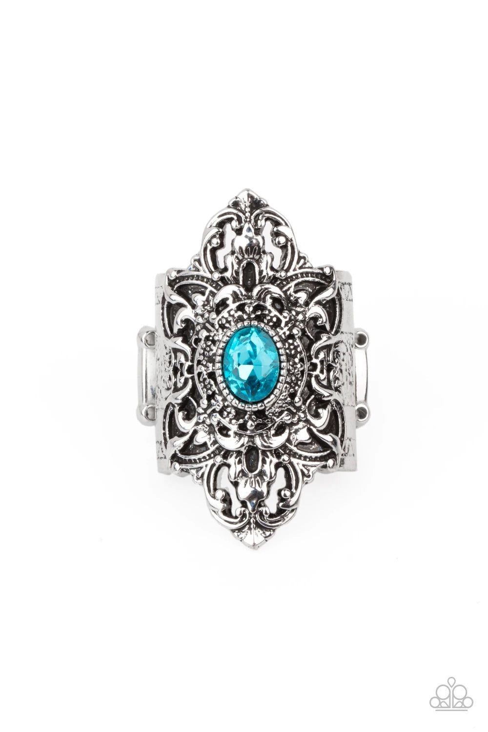 A glittery blue rhinestone adorns the center of a scalloped silver frame that is embossed in a rustic floral backdrop, creating a leafy centerpiece atop the finger. Features a stretchy band for a flexible fit.