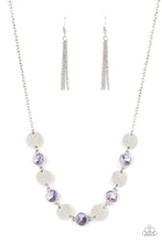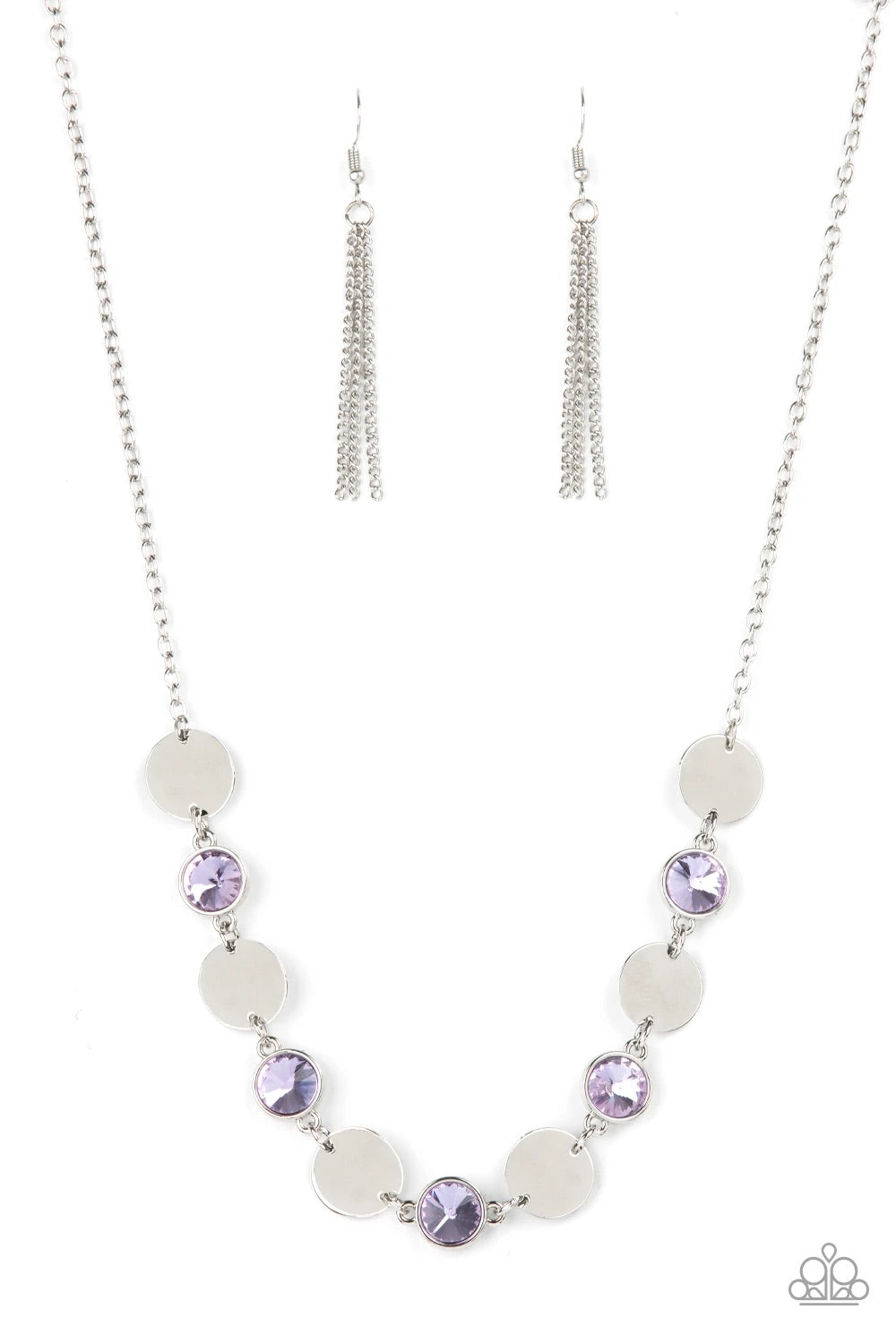 Shiny silver discs and oversized glassy purple gems delicately link below the collar, creating a sparkly statement piece. Features an adjustable clasp closure.