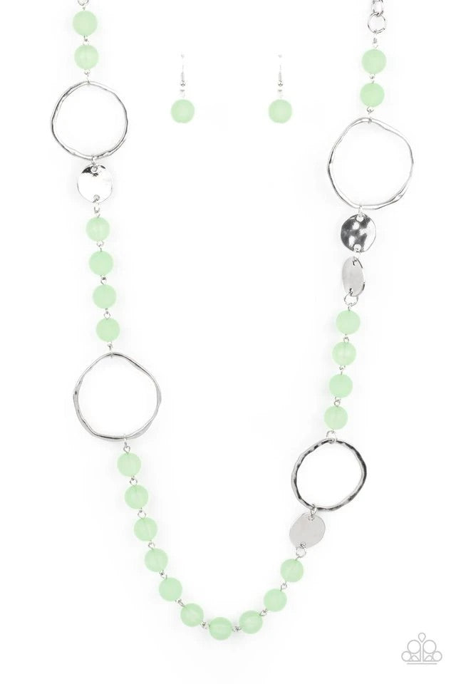 Connecting to strands of basic silver links, cloudy Green Ash beads alternate with hammered silver discs and oversized rings creating a subtle seaside vibe as they fall across the chest. Features an adjustable clasp closure