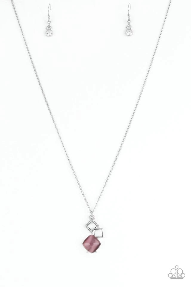 A white rhinestone encrusted square, a shimmery silver square, and a glowing purple moonstone tumble down the chest, coalescing into a stylish pendant. Features an adjustable clasp closure. Sold as one individual necklace. Includes one pair of matching earrings.