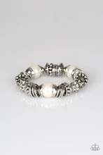 A collection of oversized white pearls, mismatched silver accents, and white rhinestone encrusted beads are threaded along a stretchy band around the wrist for a show-stopping look. Sold as one individual bracelet.